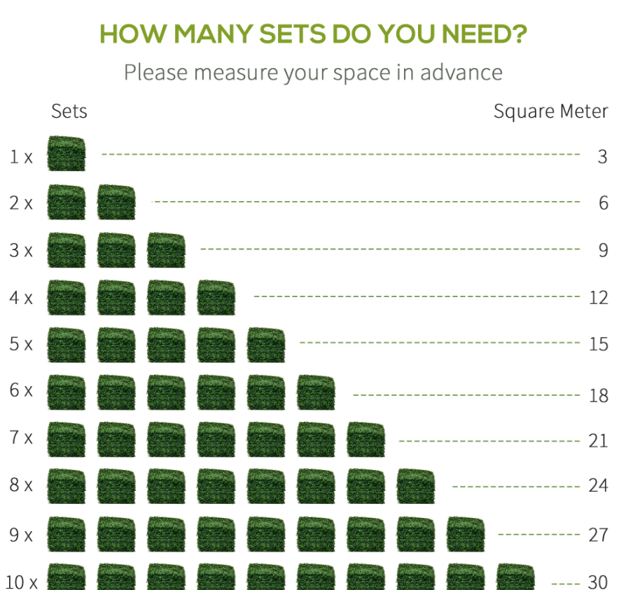 - Set includes 12 artificial grass tiles measuring 19.75 x 19.75 inches