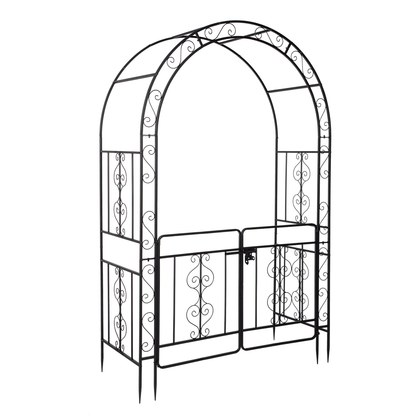 Black Wrought Iron Garden Arch with Double Deck and Door - 7ft Rounded Arbor Trellis