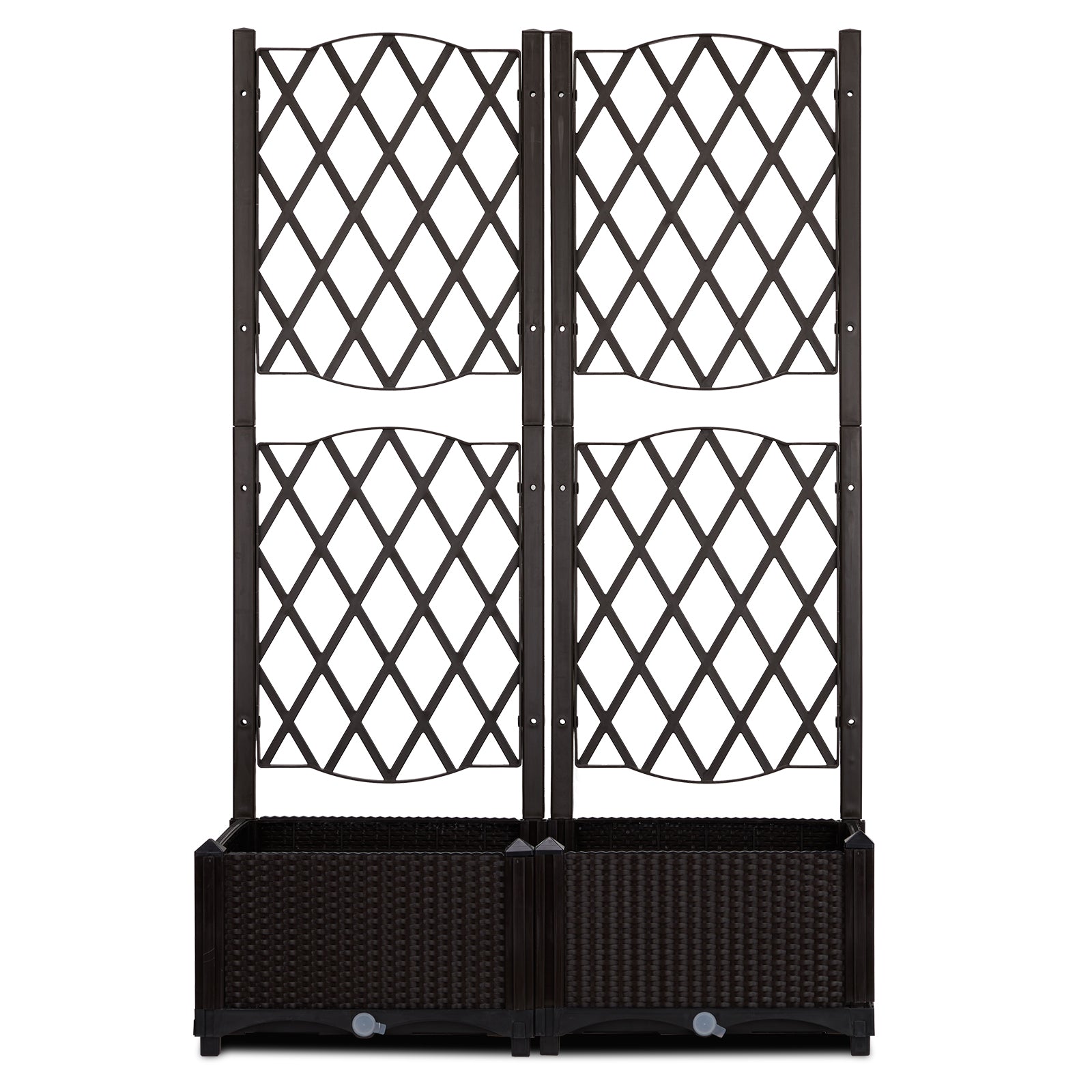Enhance your garden, patio, or balcony with this elegant tall trellis planter box. Combining a sleek carbon wicker finish with practical features, it supports vertical plant growth while offering space-saving beauty. Its UV-resistant plastic ensures year-round outdoor durability, and integrated drainage keeps your plants healthy. Perfect for flowers, vines, or climbing greenery, this freestanding unit doubles as a decorative garden screen or privacy feature.