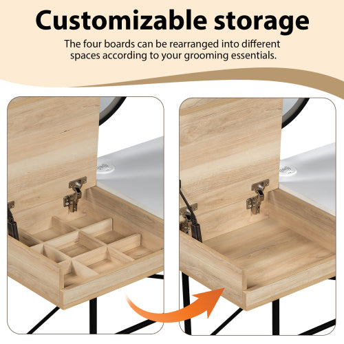 With a large drawer and three open shelves, it offers ample storage for makeup, skincare products, or accessories. The mirror lighting includes warm yellow, warm white, and cool white modes to suit different environments. Plus, the built-in wireless charger and USB port let you power up your devices while getting ready.